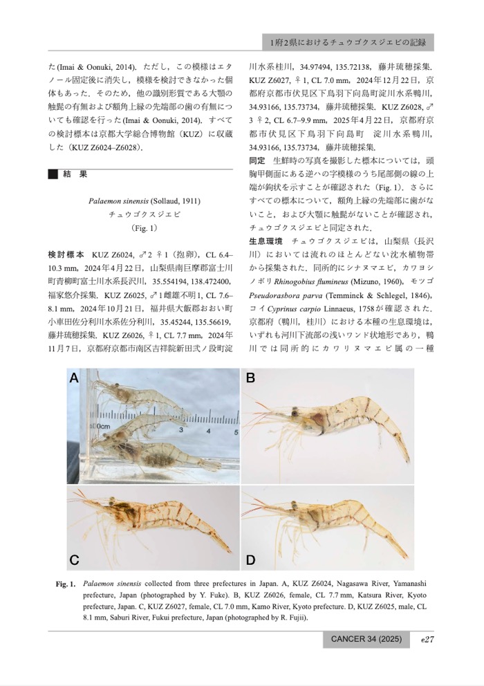 3つ目の藤井・福家「1府2県におけるチュウゴクスジエビの新規および追加記録」は、外来種チュウゴクスジエビが山梨県と福井県から初記録された、という内容です。併せて、京都府からの追加記録を報告しています。第一著者の精力的なフィールドワークの成果です!