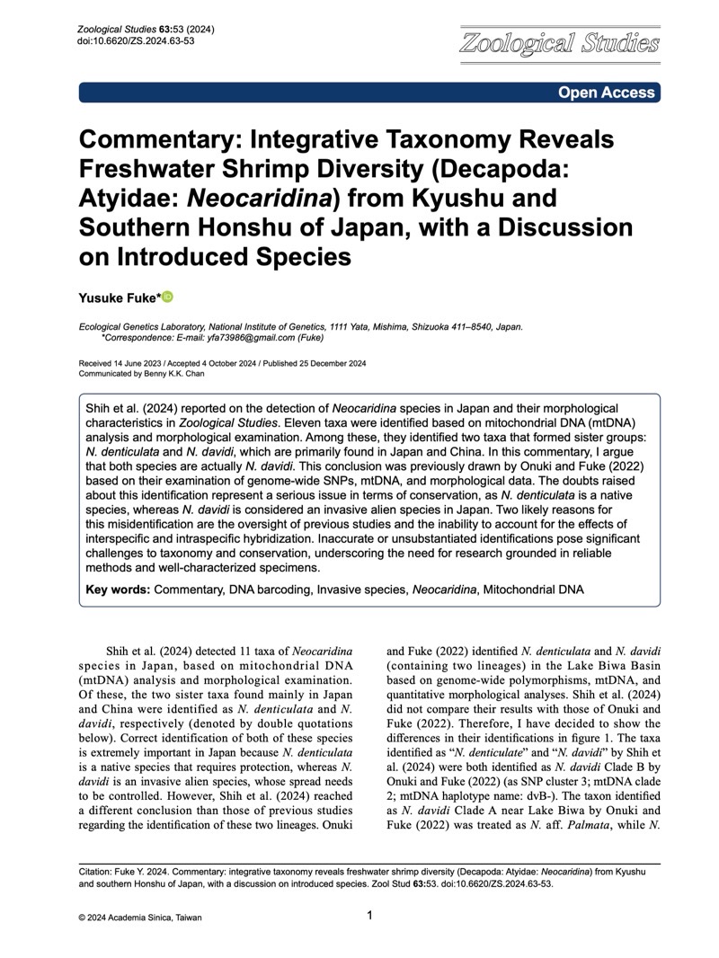 初のコメンタリー論文が出版されました!(Fuke, 2024)。日本のカワリヌマエビ類に関する先行研究について、同定が間違っているのではないかという指摘をしています。カワリヌマエビ類では、同定が間違っている研究はたくさんあるのですが、今回は私たちが外来種とみなしているタクソンを在来種と同定していたので、他の研究者の混乱や保全・外来種管理上の混乱を未然に防ぐためにコメンタリーとして発表しました。オープンアクセスです!