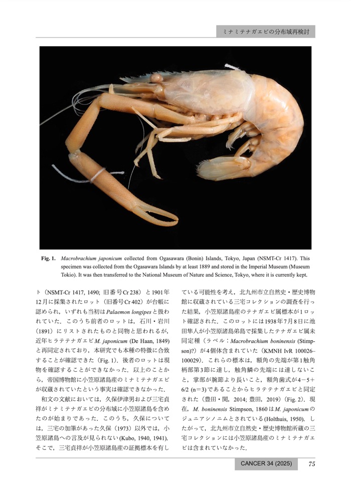 まず、福家・竹下・小松「ミナミテナガエビは小笠原諸島に分布するのか?」は、小笠原諸島に分布するとされるミナミテナガエビの文献および標本記録を明治期まで遡って洗い直し、小笠原諸島における本種の確かな記録が実は存在しないことを示唆する結果を得たものです。