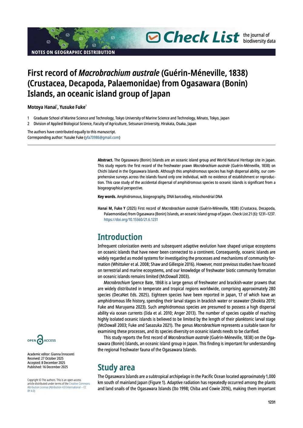 Check List誌から小笠原諸島におけるザラテテナガエビの初記録論文(Hanai & Fuke, 2025)が出版されました!オープンアクセスです。花井さんが圧倒的豪運&実力によって父島から採集した1個体を同定し、報告しました。今回得られた標本は、両側回遊型の種が海洋島に稀に分散するという、本来観察が極めて難しい事象の貴重な証拠であり、海洋島における淡水エビ相の形成に重要な示唆を与えてくれます。浮遊期の長い種は現代においても他の地域から小笠原諸島にたどり着くんだなぁと感心しました。