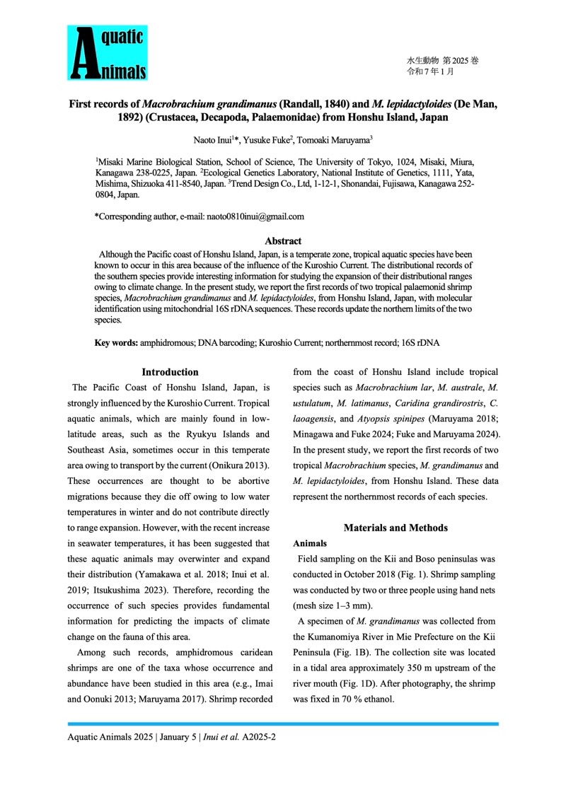 新年1本目の共著論文が出版されました!(Inui et al. 2025)。なんと本州初記録のオオテナガエビとマガタマテナガエビの記録です。もちろん北限記録です。自分はDNAバーコーディングによる貢献です。オープンアクセスです!