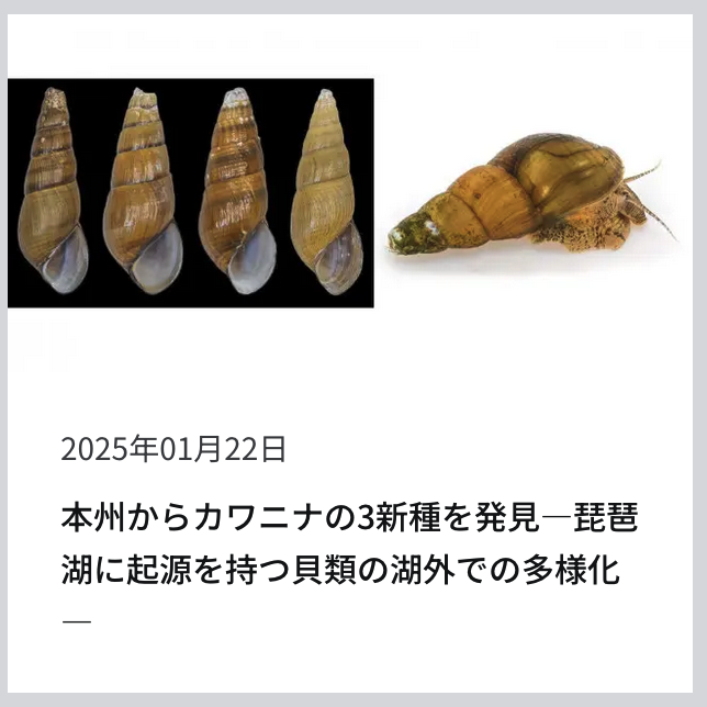 共著論文が出版されました(Sawada et al., 2024)。琵琶湖のカワニナ属の分類学的再検討の続編です。新種アザイカワニナが記載されました。自分はMIG-seqによる遺伝解析をわずかにお手伝いをしました。京大と遺伝研からプレスリリースが出ています。